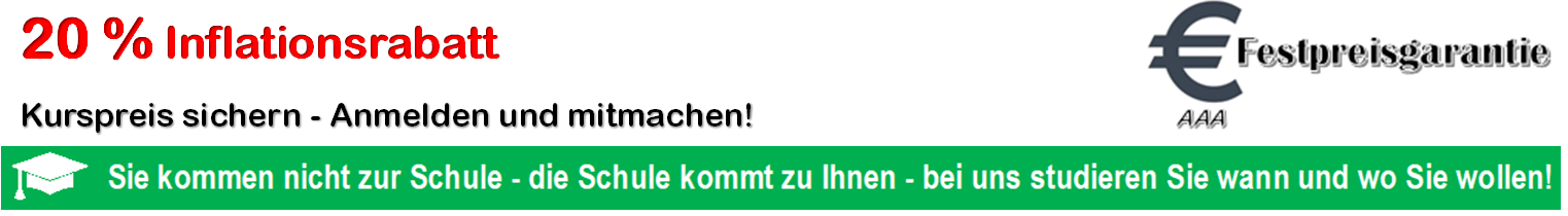Beachten Sie unsere aktuellen Aktionsrabatte. Für mehr Informationen zum Angebot unserer Bildungseinrichtung (Privatschule) wenden Sie sich bitte an unser Sekretariat / Serviceteam 24/7.